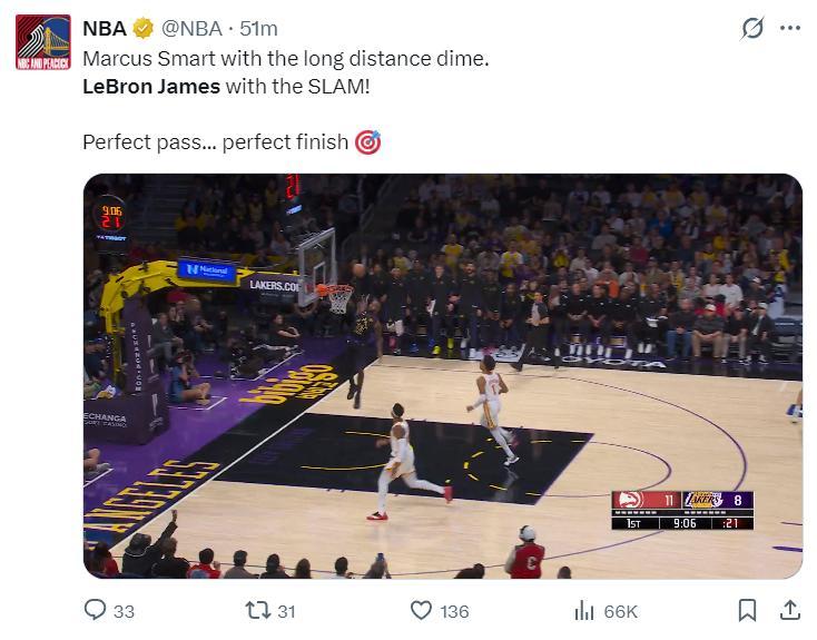 末節開場詹姆斯籃下單打古耶得手,想造古耶犯規沒造成,詹姆斯一個低級失誤但奧孔古空籃沒扣進,詹姆斯飛了好遠的暴扣,詹姆斯又製造一個犯規,詹姆斯大帽麥科勒姆一個隨後助攻艾頓,詹姆斯空切完成30+,雷迪克換下末節12分的詹姆斯,詹姆斯只差1個籃板球就創造最年長的30+三雙紀錄,雷迪克不讓他多打1分鐘略顯遺憾。