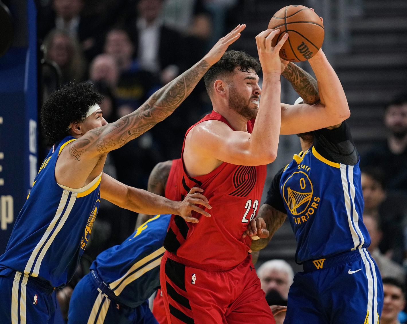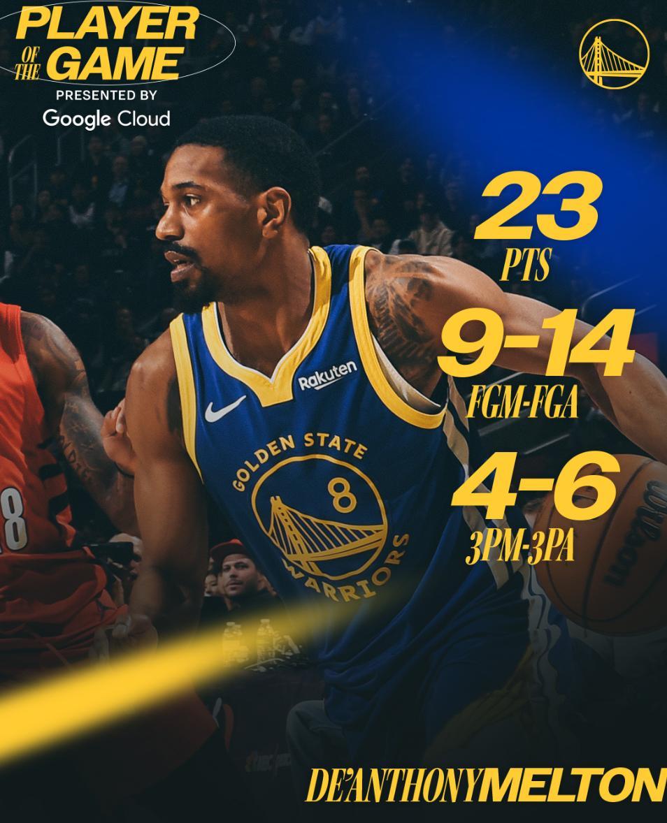 末節,科爾直接用波傑姆斯基、梅爾頓、理查德、桑托斯、霍福德的第三陣容了,開拓者是一個正常的輪換可他們這套正常輪換硬實力也非常孱弱,隨後梅爾頓連拿11分接管比賽,他打成庫裏,比賽走向完結。