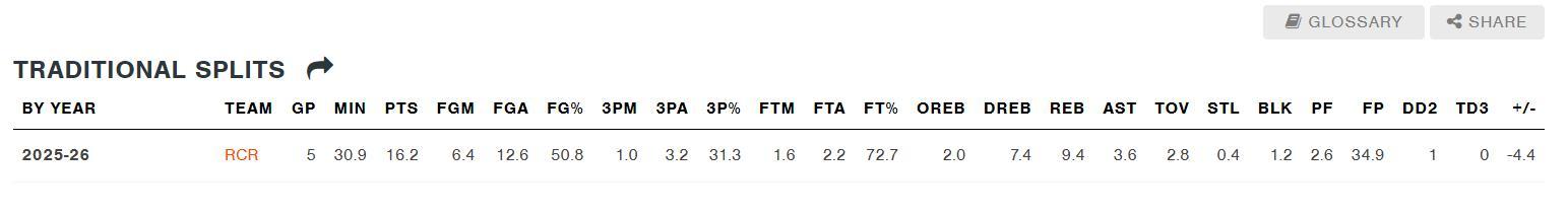 此前楊瀚森在G聯賽的五場比賽,場均30.9分鐘,拿到16.2分9.4籃板3.6助攻0.4搶斷1.2蓋帽,命中率50.8%,這場比賽得分、助攻都達到了平均水準,就是籃板差一點。