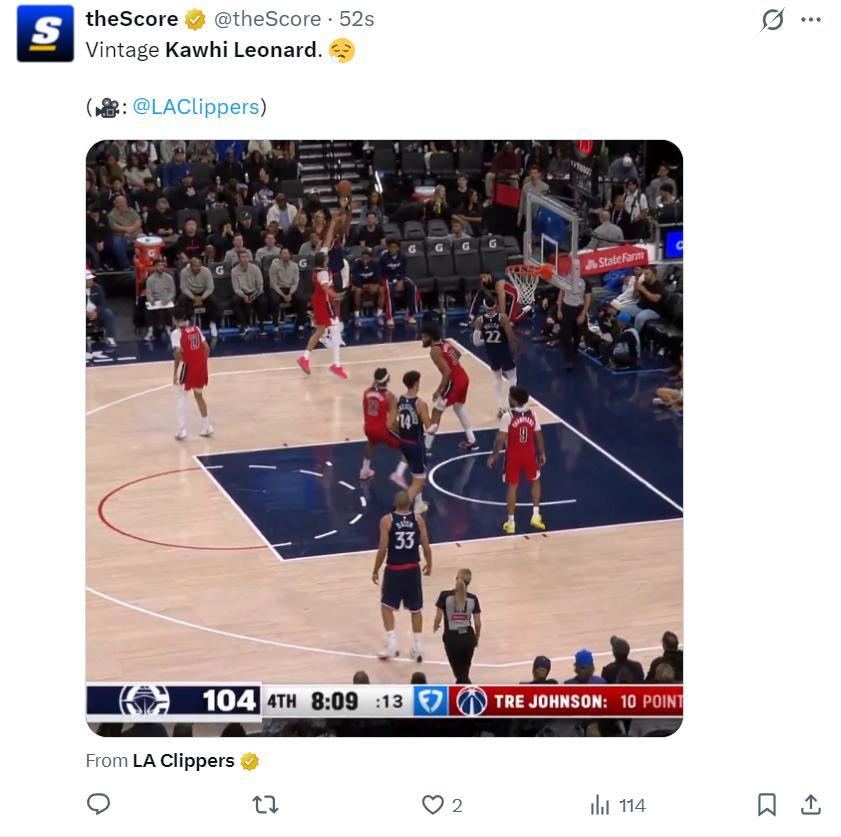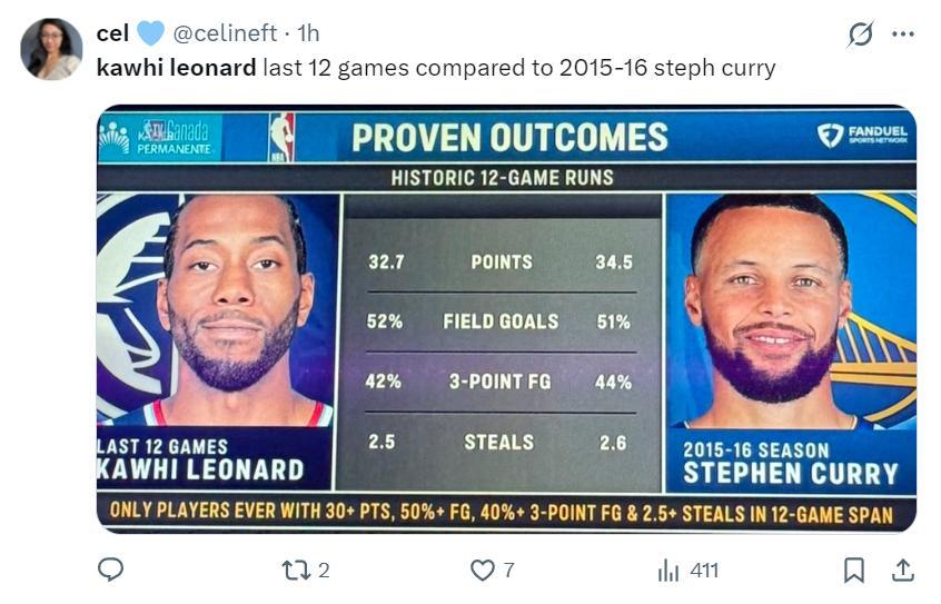 此役後萊昂納德場均數據提升到33.9分鐘,拿到28.1分6.4籃板3.4助攻2.2搶斷0.7蓋帽,命中率50.1%,三分命中率38.8%。已經有快船媒體認爲小卡本賽季也有希望去競爭最快進步球員了,34歲重新進入巔峯?