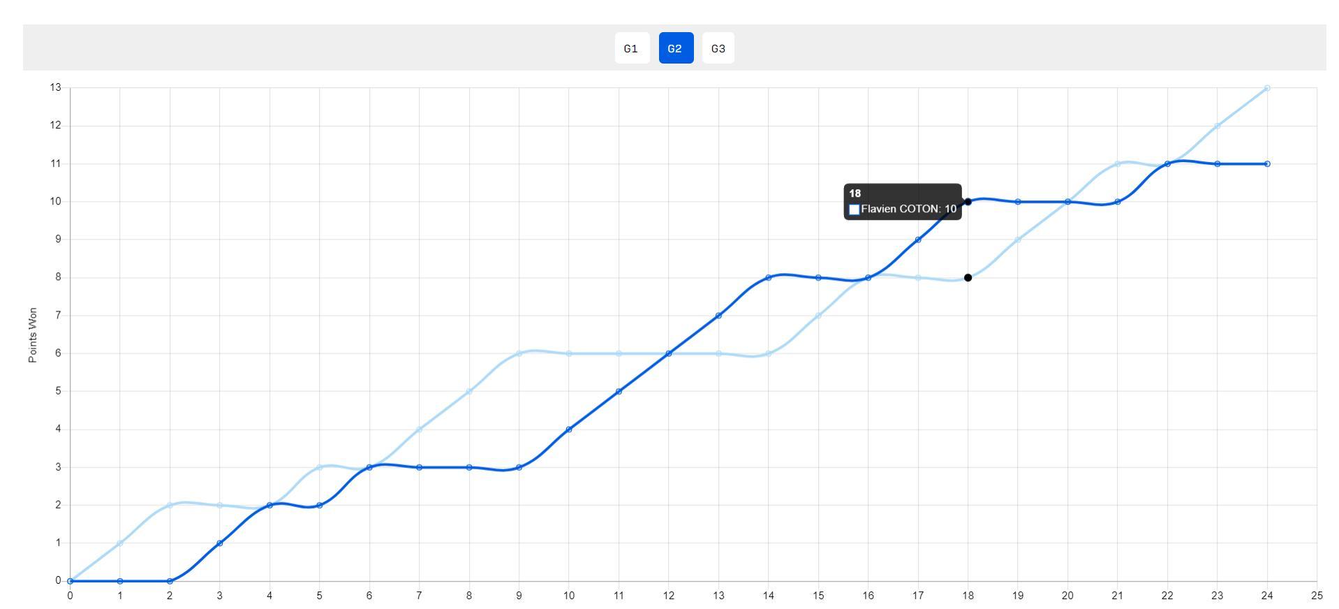 法國小將科頓跟陳俊菘一樣都是後起之秀,這場比賽的第一局就是火星撞地球,陳俊菘一度7-4領先,科頓追到8-8,隨後兩人開始交替領先,科頓一度12-11,陳俊菘追到13-13,最終陳俊菘15-13涉險過關。