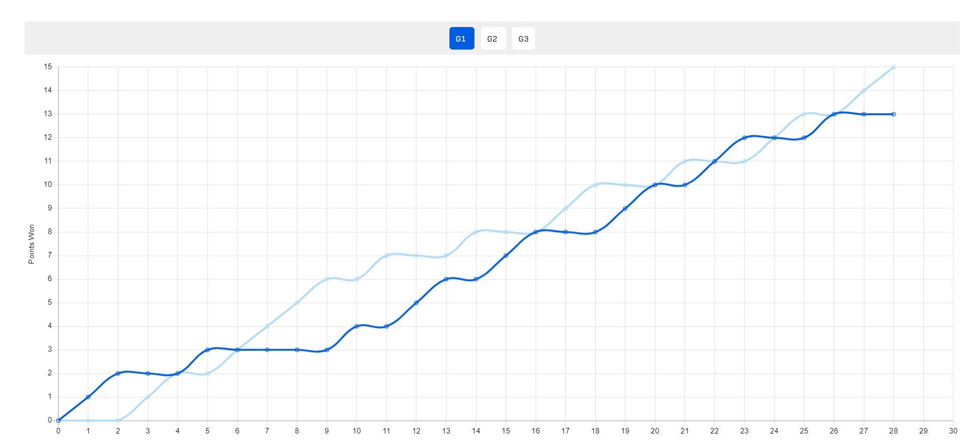 第二局陳俊菘開場6-3領先,隨後陳俊菘崩盤被科頓打出5-0反超,科頓一度10-8拿到局點,陳俊菘連續挽救局點最終13-11逆轉。