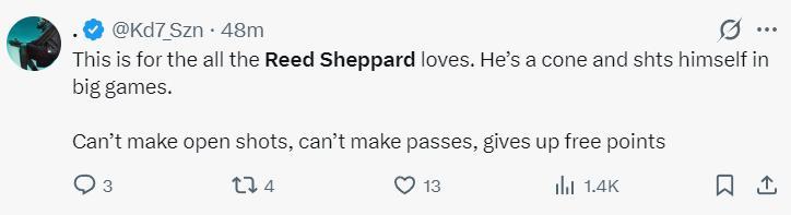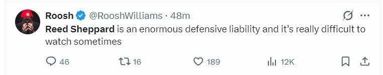 休媒瘋狂朝着謝潑德開炮,Roosh:裏德-謝潑德是個超級的防守漏洞,有時看着他打球真是讓人難受。