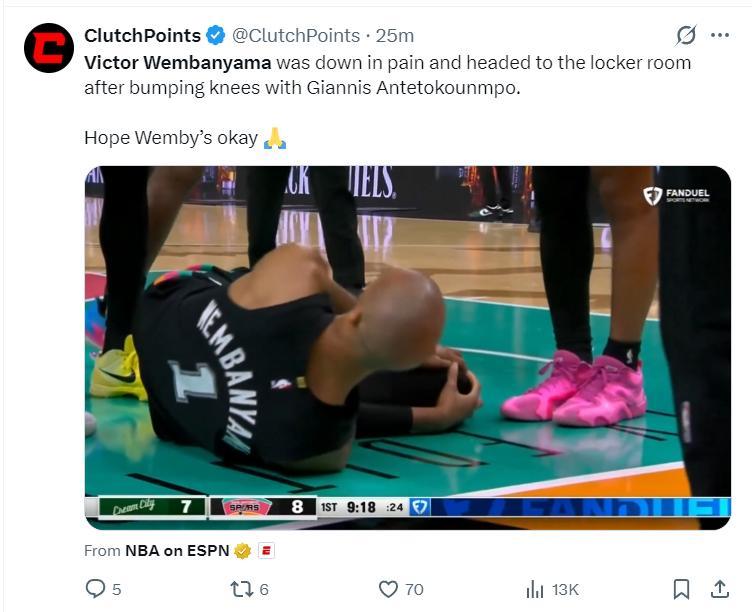 末節揚尼斯與文班亞馬兩人都沒登場,因爲第三節馬刺淨勝24分後兩隊的分差太大,所以這兩位球星在末節都提前打卡了。