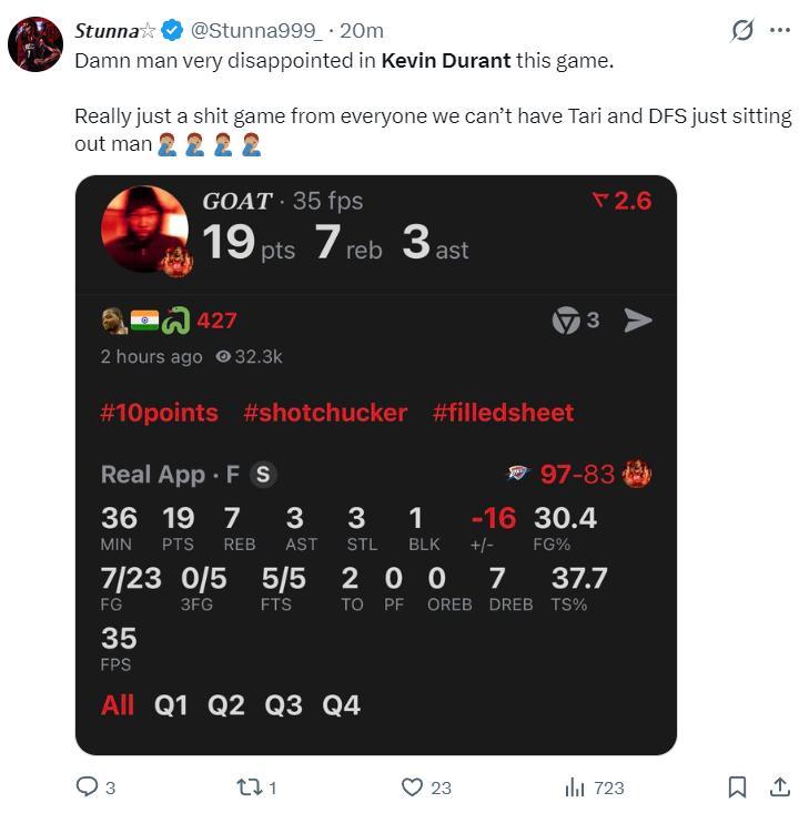 全場比賽杜蘭特36分鐘,23中7+三分5中0,拿19分7籃板3助攻3搶斷1蓋帽2失誤,命中率30.4%,三分命中率0%,真實命中率37.7%(此役是杜蘭特火箭生涯第二低的命中率)。杜蘭特球迷都說KD表現太糟糕,火箭隊太需要伊森與芬尼史密斯。