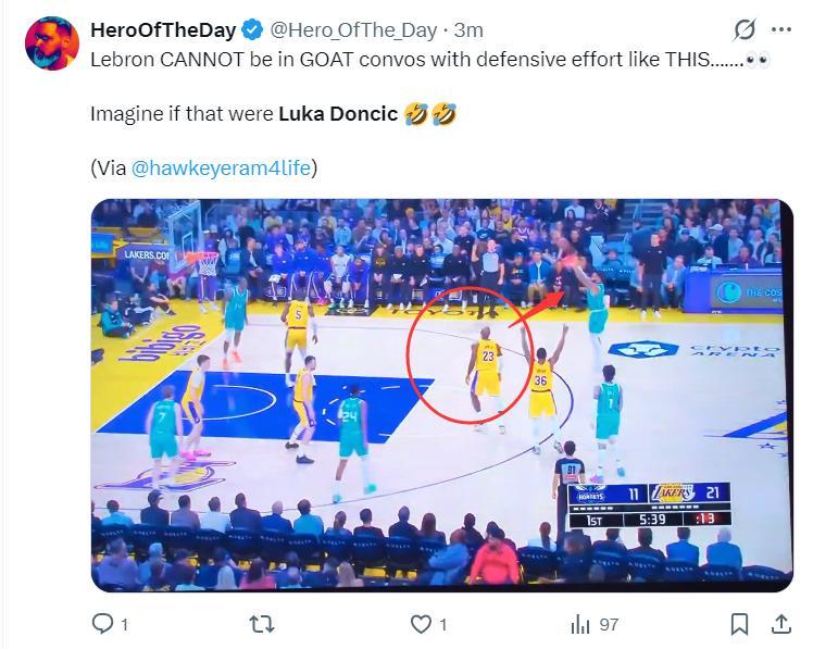 首節詹姆斯打8分鐘,3中2+三分2中1拿到5分1籃板0助攻1搶斷1蓋帽,但他有一個目送對手三分命中的瞬間,詹黑媒體立馬炮轟:詹姆斯絕對不該以這樣的防守態度去評選最佳球員,試想如果是東契奇這樣漏防會是什麼風評?