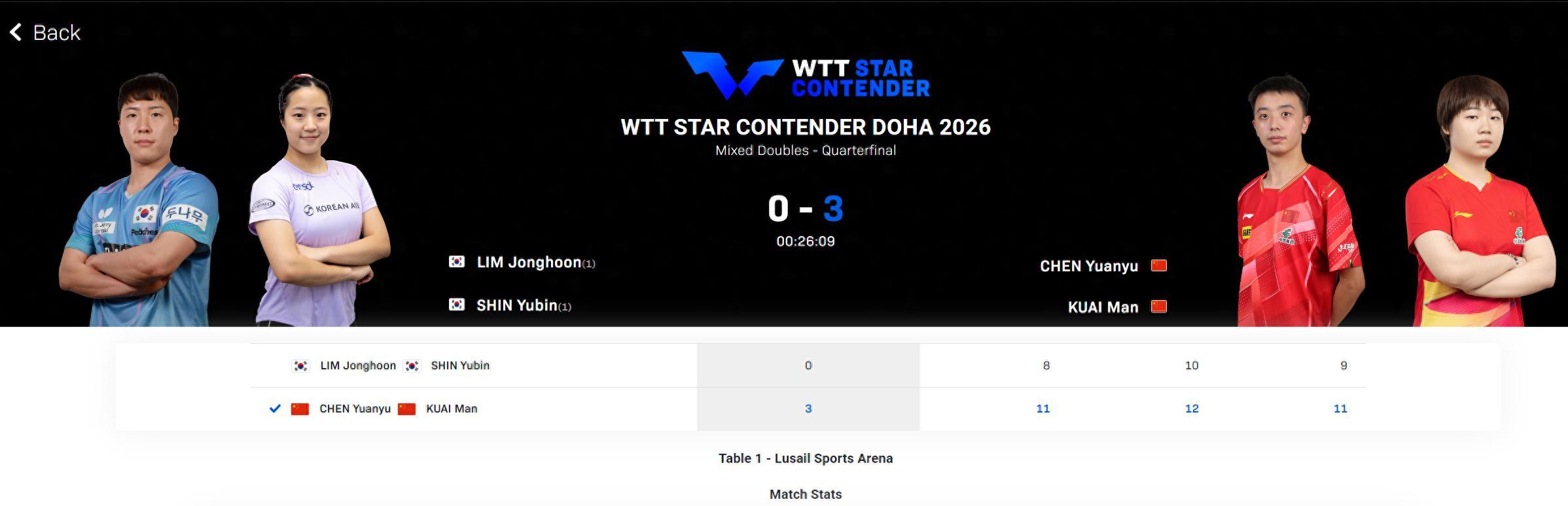 北京時間1月16日,WTT多哈球星挑戰賽混雙1/4決賽,國乒組合蒯曼/陳垣宇3-0橫掃韓乒組合林鐘勳/申裕斌,三局比分:11-8,12-10,11-9。沒想到世界第二的混雙組合林鐘勳/申裕斌止步八強,國乒全新的混雙組合蒯曼/陳垣宇完成了一場爆冷。