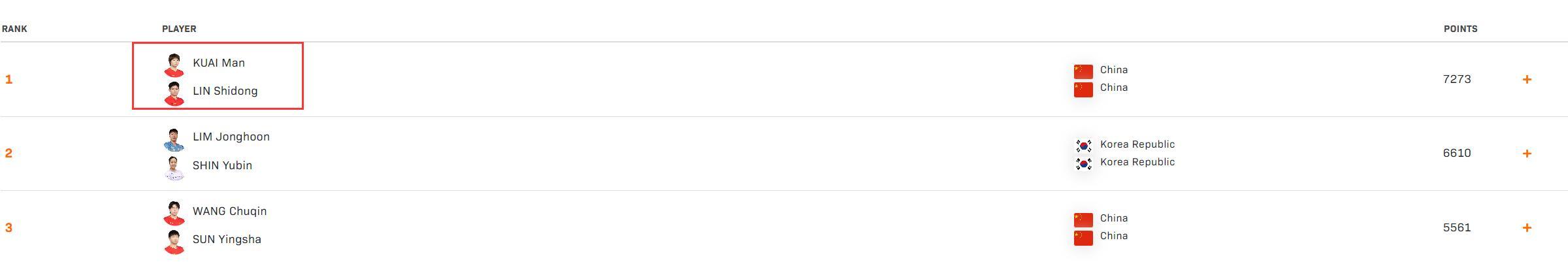 第三局申裕斌/林鐘勳又是7-3領先,蒯曼連續得分追到7-7,隨後兩隊鏖戰到9-9,關鍵分還是國乒組合拿下。