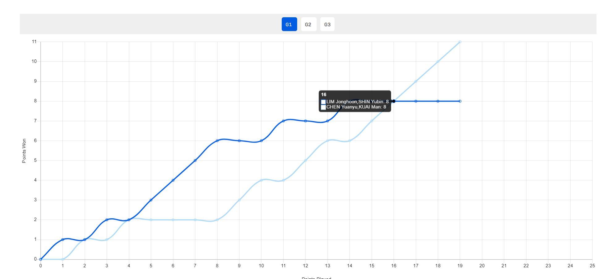 第二局申裕斌/林鐘勳又是6-2領先,申裕斌/林鐘勳還一度10-8拿到局點,蒯曼/陳垣宇挽救兩個局點後實現逆轉,這一局後國乒組合士氣大振。
