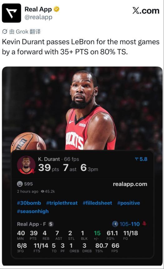 4.杜蘭特超過詹姆斯成爲歷史35+真實命中率80%最多的前鋒;