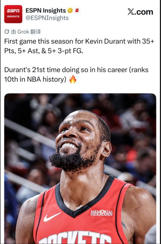 3.這是杜蘭特火箭生涯首次35+5+5三分的場次;