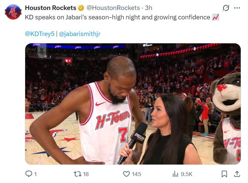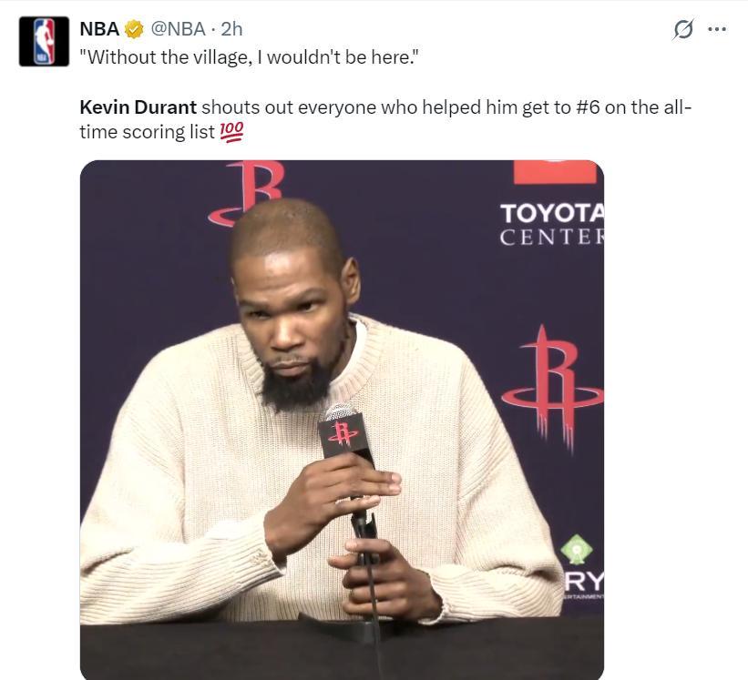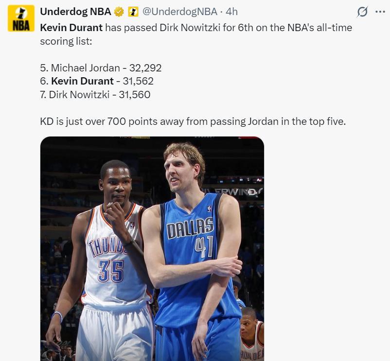 賽後杜蘭特談到自己的得分升至歷史第六:這意義重大,德克是我敬仰的榜樣,也是我曾對抗過的對手。我很榮幸能與這些偉大的球員並肩在得分榜單上。