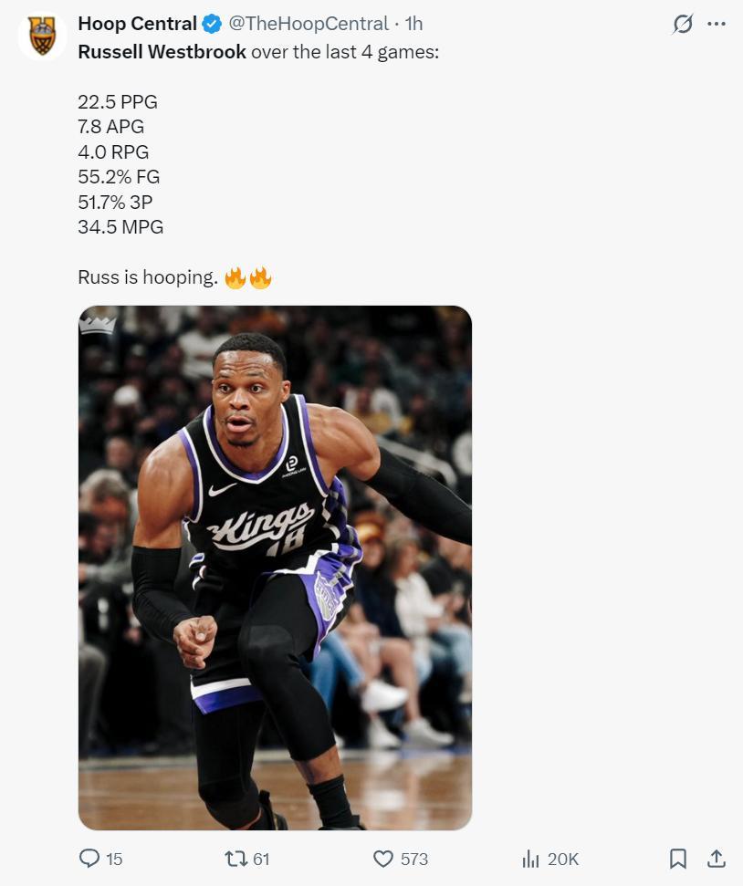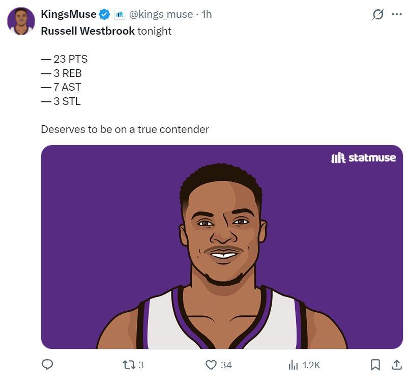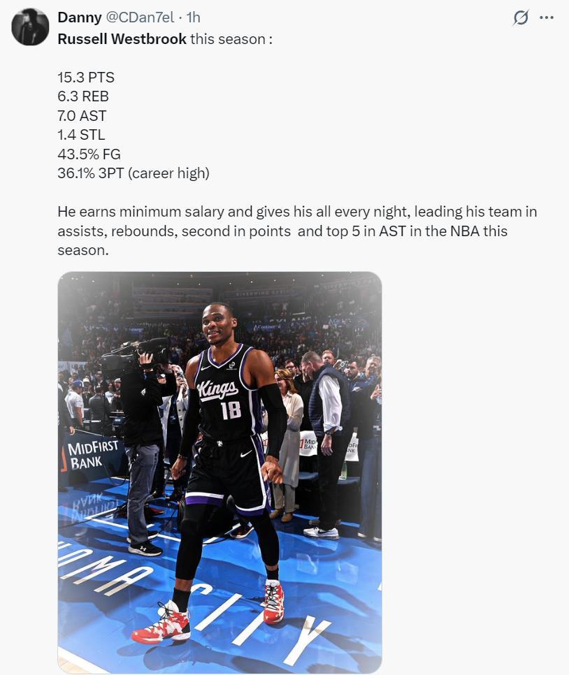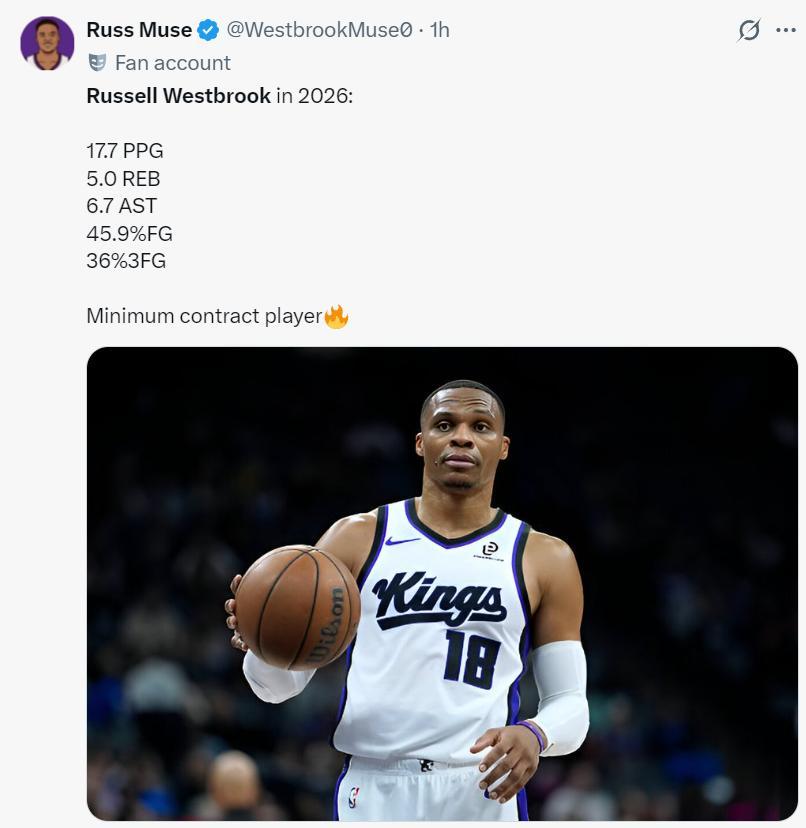 他寫道:威少的表現真的太出色了,他拿着最低的工資單每晚都全力以赴,他的助攻、籃板、得分在國王都名列前茅,助攻還是聯盟前五的水準,我們應該看看交易截止日進入最後兩週,他能不能轉投到一些有爭冠競爭力的球隊。