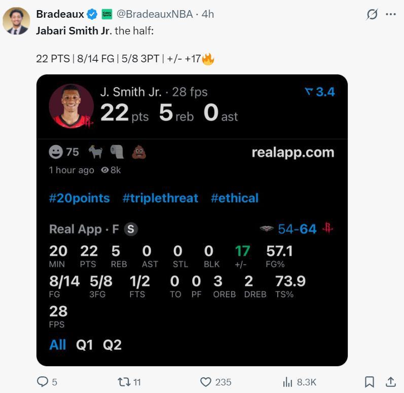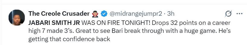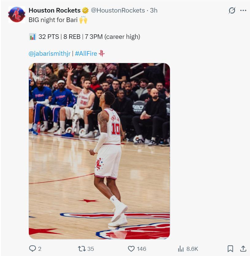 這場比賽小賈巴里-史密斯是全隊最高光的一個,他在末節命中第二個三分球時怒吼釋放,這場比賽對他來說算是掃去陰霾的一戰,因爲上一場小賈12中3,對陣雷霆一戰15中3,小賈進入1月後狀態下滑非常嚴重。