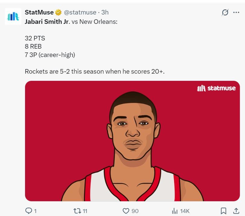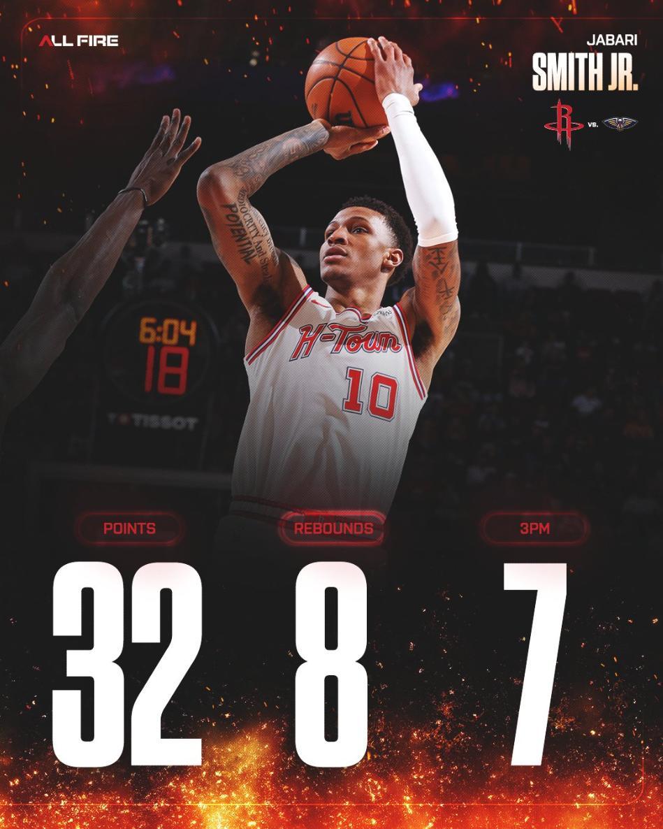 全場比賽小賈巴里-史密斯41分鐘,21中11,三分13中7,罰球4中3,拿到32分8籃板1蓋帽,命中率52.4%,三分命中率53.8%,正負值+21。