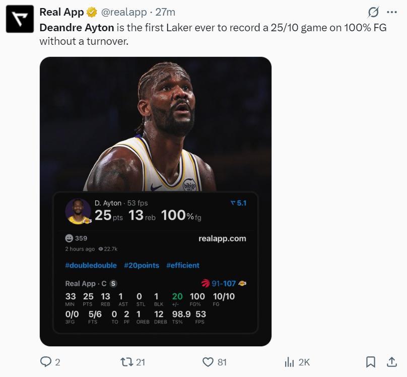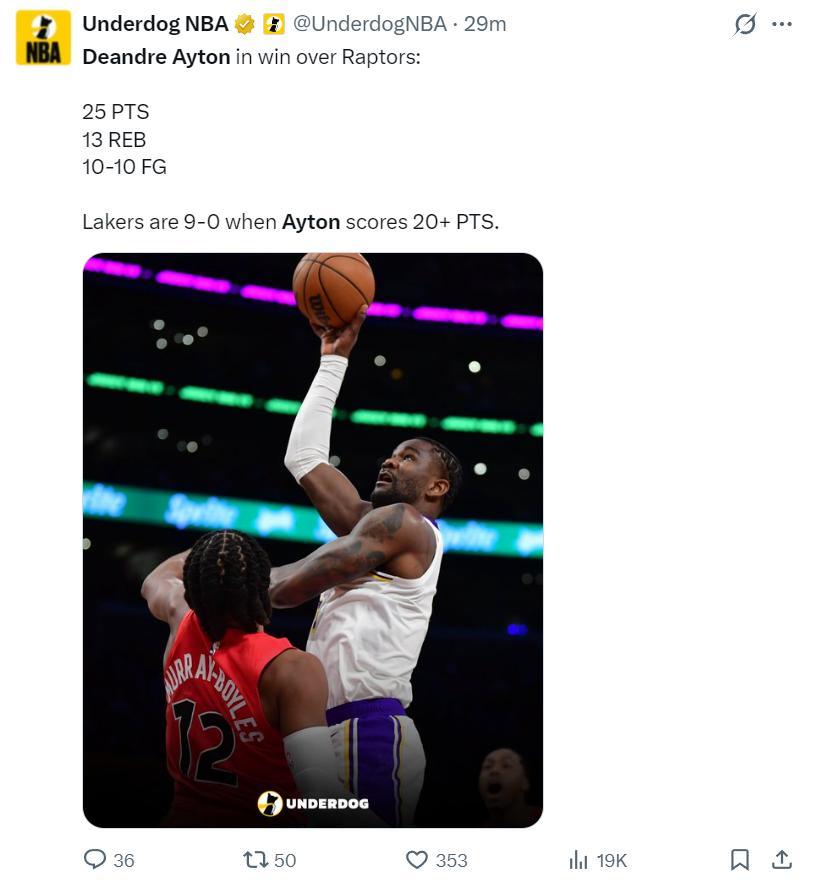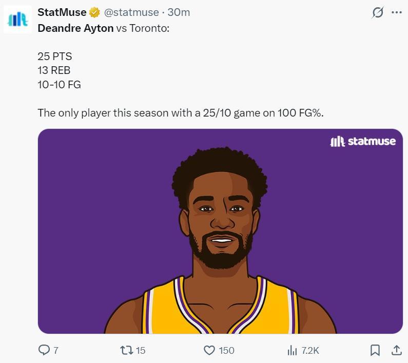 這場比賽後艾頓創造了多項紀錄:1.艾頓成爲湖人隊史首位100%+25+10+0失誤的球員;