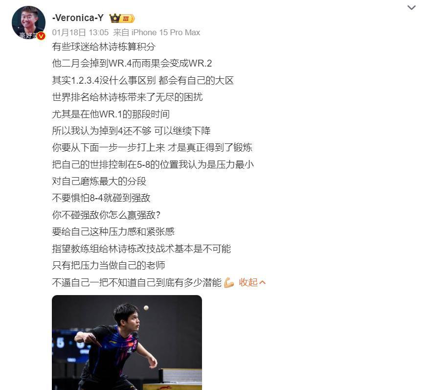 大V甚至覺得林詩棟不該繼續停留在男單世界第二的位置,因爲這個排名太高給他帶來了無盡的困擾,尤其在林詩棟世界第一那段時間他被抨擊的更多。他需要從頭開始一步步打上來才能得到真的鍛鍊,他掉到第五-第八壓力最小,也是對他最大的磨鍊。指望教練組給林詩棟改技戰術基本是不可能的,只有讓壓力變成自己的老師才能激發更多潛能。