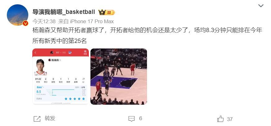 媒體人導演:楊瀚森場均只有8.3分鐘只能排在新秀中的第25名,開拓者給他的機會還是太少了。