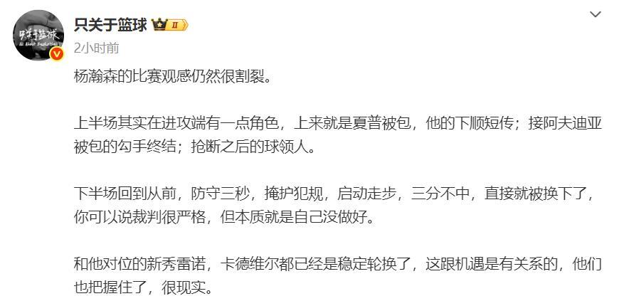 自媒體:楊瀚森的比賽觀感很割裂,上半場進攻端還有一點角色,下半場就回到從前,防守三秒、掩護犯規、啓動走步,三分不中就被換下。和他對位的新秀雷諾、卡德維爾已經是穩定內線輪換。