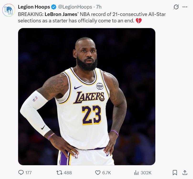 不過美媒LH還是寫道:21年來詹姆斯首次未能入選全明星先發,心碎。