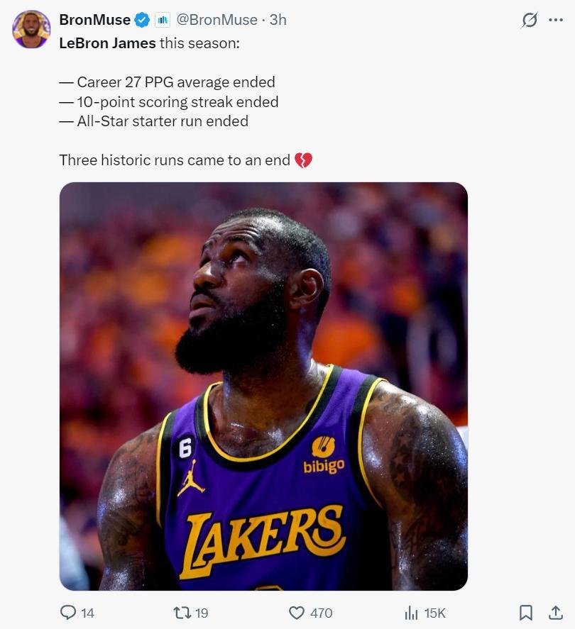 湖媒寫道:本賽季41歲的詹姆斯已經連續終結了三項紀錄,生涯場均27分的紀錄結束、連續1297場得分上雙的紀錄結束、連續21年入選全明星先發的紀錄結束。三次輝煌的征程就這樣終結了。