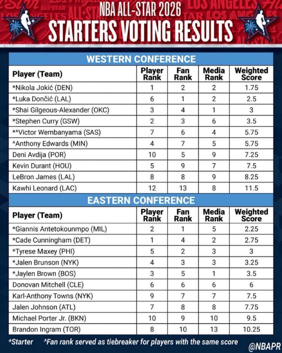 算上球員投票,球員投票詹姆斯是第八,球迷投票第八+球員投票第八,最終詹姆斯排在西部第九的位置無緣全明星先發,而湖人的東契奇球迷投票第一+球員投票第六最終排名是第二。