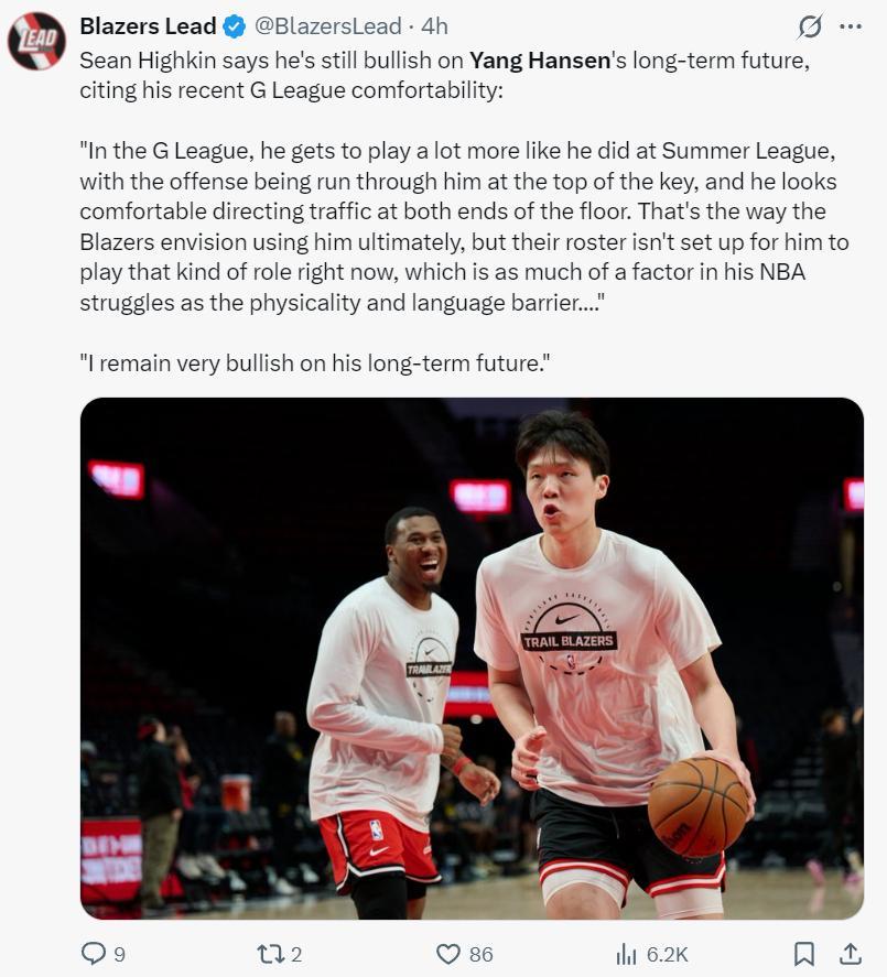 開拓者專家肖恩-海金這樣評價楊瀚森:我依舊看好楊瀚森的長遠未來,他近期在發展聯盟表現的遊刃有餘,在G聯賽他有球權可以更多像打夏季聯賽那樣打球,全隊的進攻由他掌控,他在底線的組織非常出色,攻防兩端指揮調度得心應手,這正是開拓者管理層預想未來楊瀚森的樣子。只是目前開拓者的陣容、體系不適合讓他扮演那樣的角色,在NBA的困境很大程度上是因爲身體對抗與語言障礙。