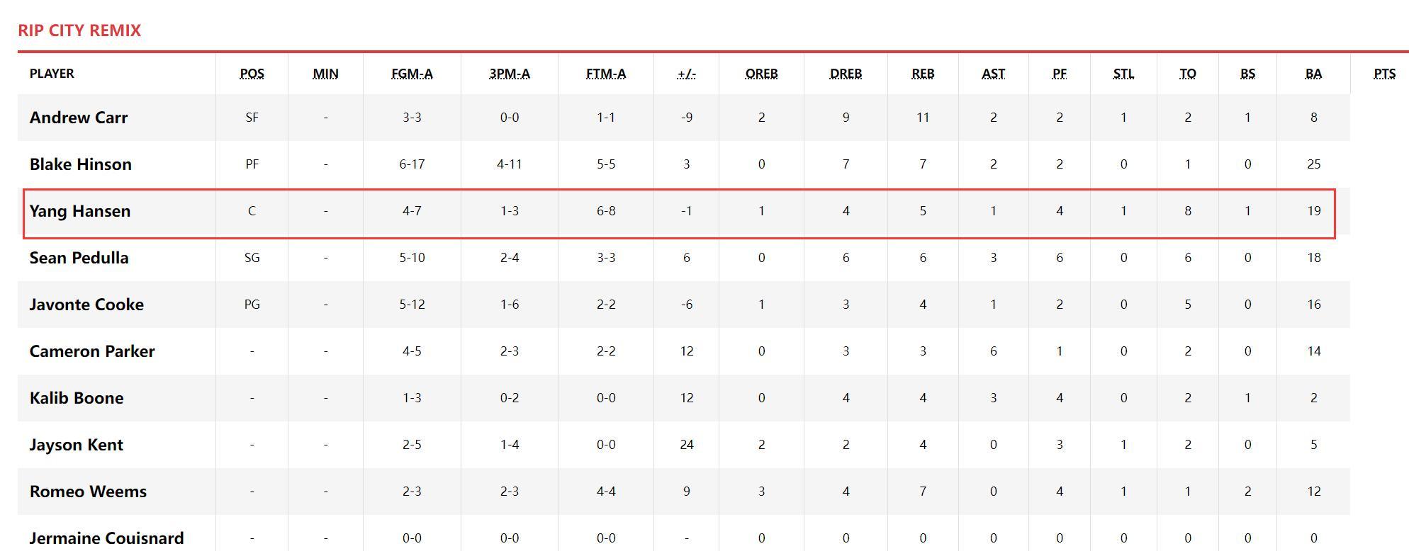 全場比賽小楊打了27分鐘,這比之前的幾場混音隊比賽時間都少(都在30分鐘左右),這說明混音主帥也知道楊瀚森疲勞,最終楊瀚森7中4,三分3中1,拿到19分5籃板1搶斷1蓋帽4犯規8失誤,命中率57.1%,失誤率、犯規率較高我認爲是瑕不掩瑜的。