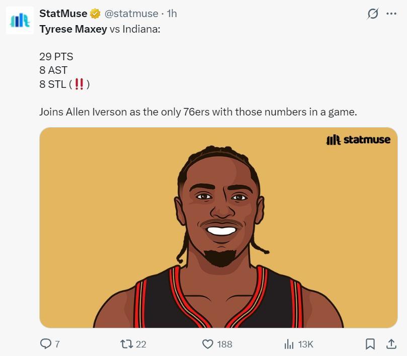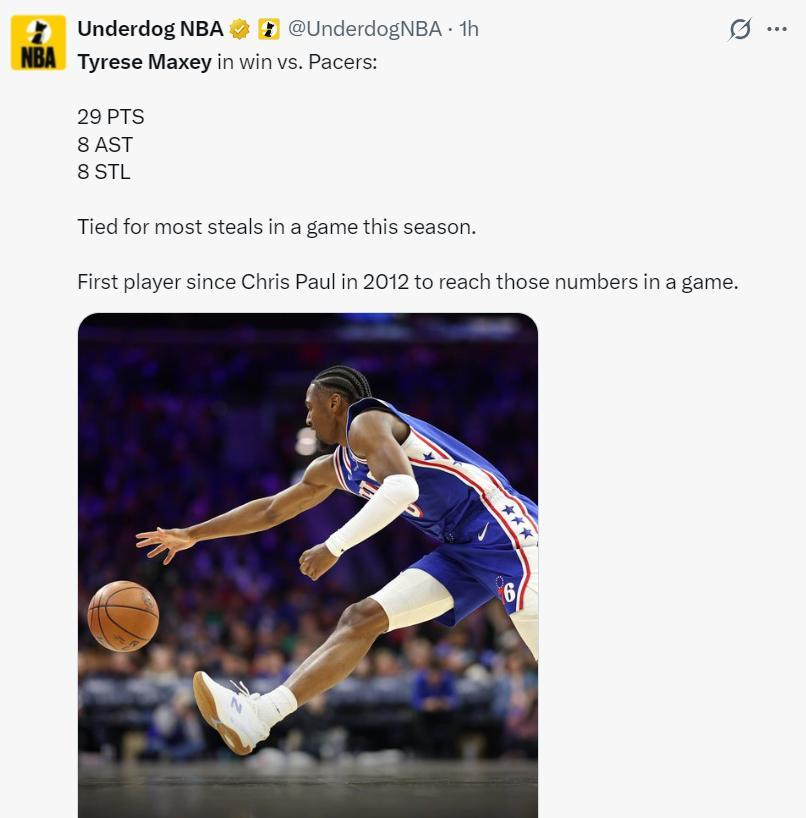 4.馬克西單場29+8+8搶斷是費城隊史自艾弗森後第二人。