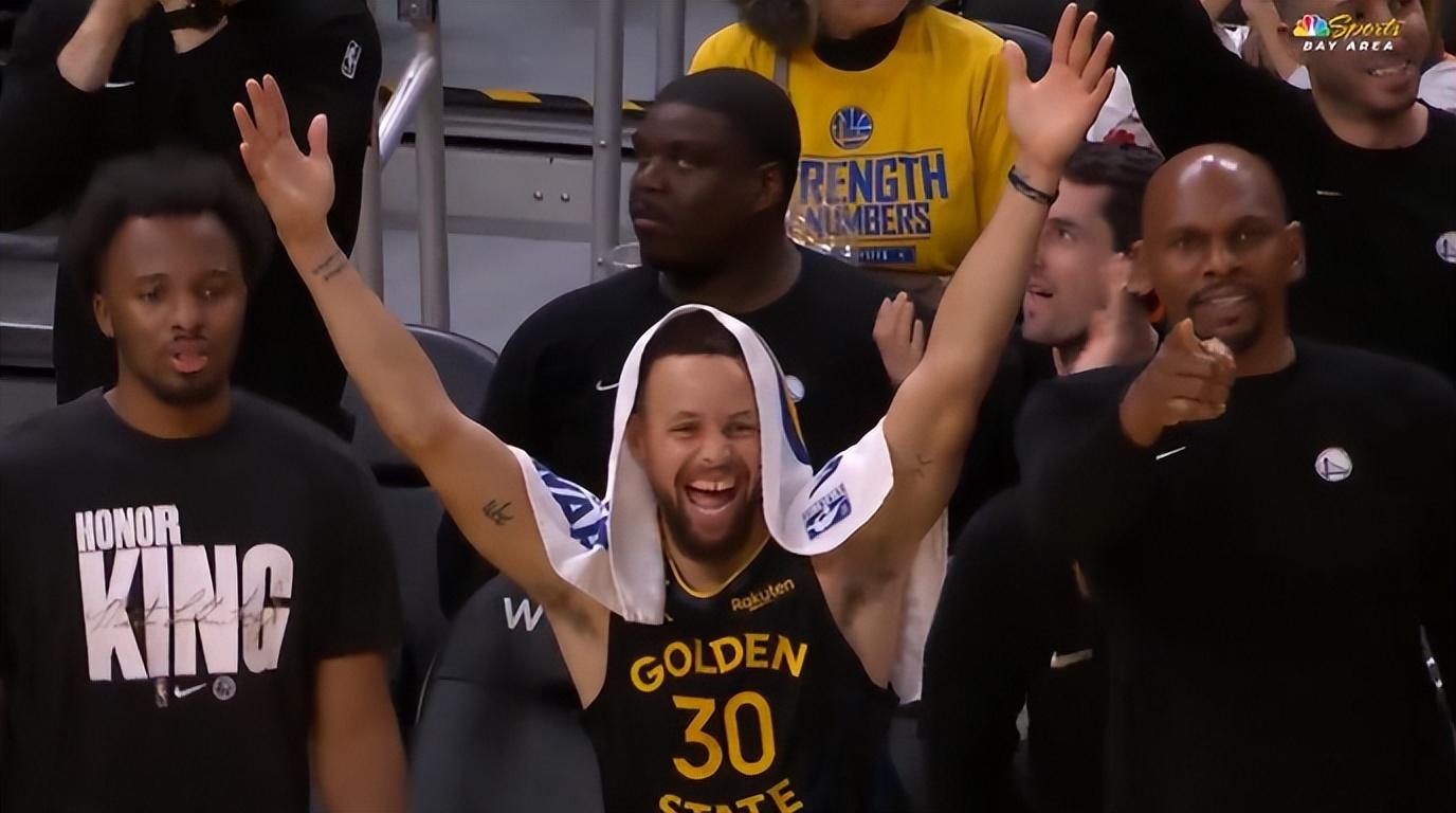 庫裏在場下的興奮勁兒很足,看到希爾德三分命中他雙手舉天+大小露齒,庫裏知道這場比賽拿下了,而且自己在末節只需要打3分鐘等於提前打卡下班。