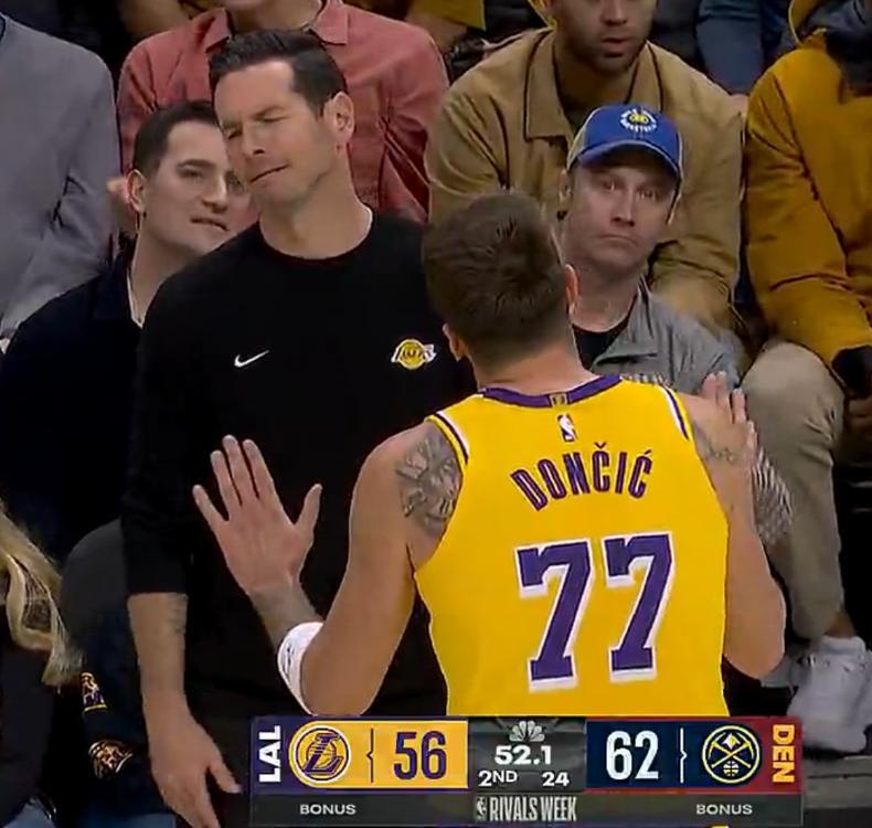 次節東契奇跟裁判抱怨之前湖人只落後6分,但因爲東契奇這個抱怨喫了一個T,大家可以看到雷迪克的表情多麼的不理解、多麼的絕望,東契奇的抱怨讓掘金連續輕鬆反擊拉開到14分!東契奇上半場拿到23分6籃板3助攻1搶斷,個人發揮依舊強勢但跟裁判糾纏不休+不退防讓湖人陷入困境。
