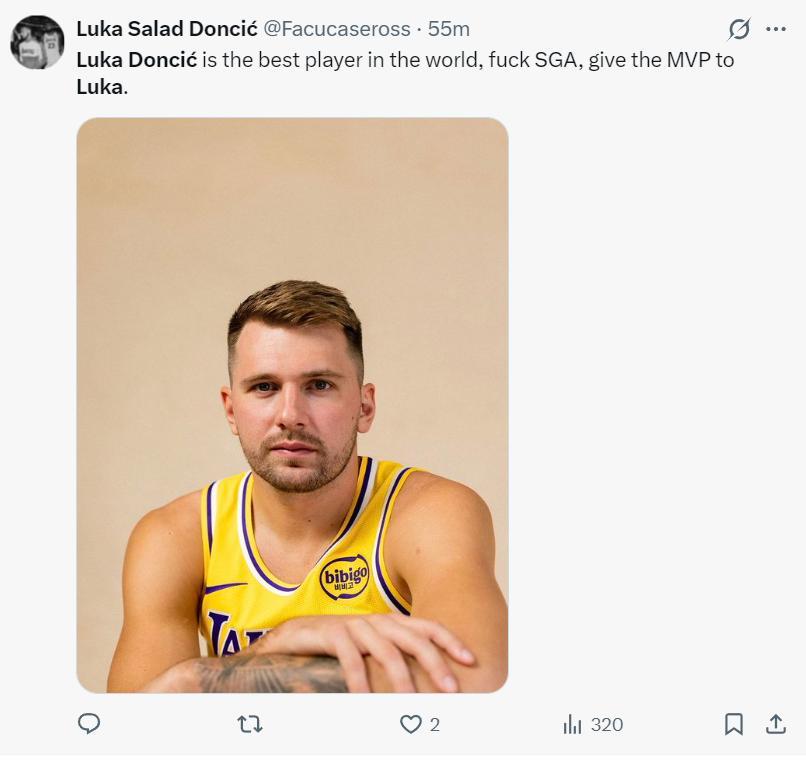 湖人球迷:東契奇才是全世界最強球員,FxxK亞歷山大,將MVP給東契奇!