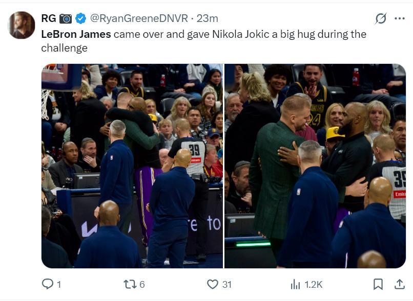 比賽結束後約基奇與詹姆斯也緊緊相擁,約基奇祝賀老詹拿到勝利,老詹祝賀約基奇入選全明星先發,超巨都是惺惺相惜。