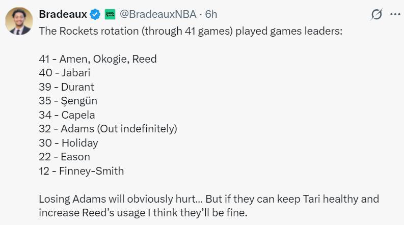 火箭記者Bradeaux曬出本賽季火箭主力們的輪換場次,目前只有阿門、奧科吉、謝潑德三人打滿了41場比賽,而伊森因傷只打22場,亞當斯雖然打了32場但目前已經無限期停賽,火記的意思是隻要伊森能繼續保持健康,讓後烏度卡提升謝潑德的登場時間依舊有超強戰力。