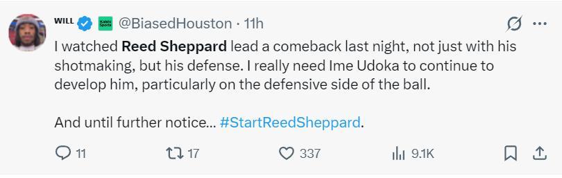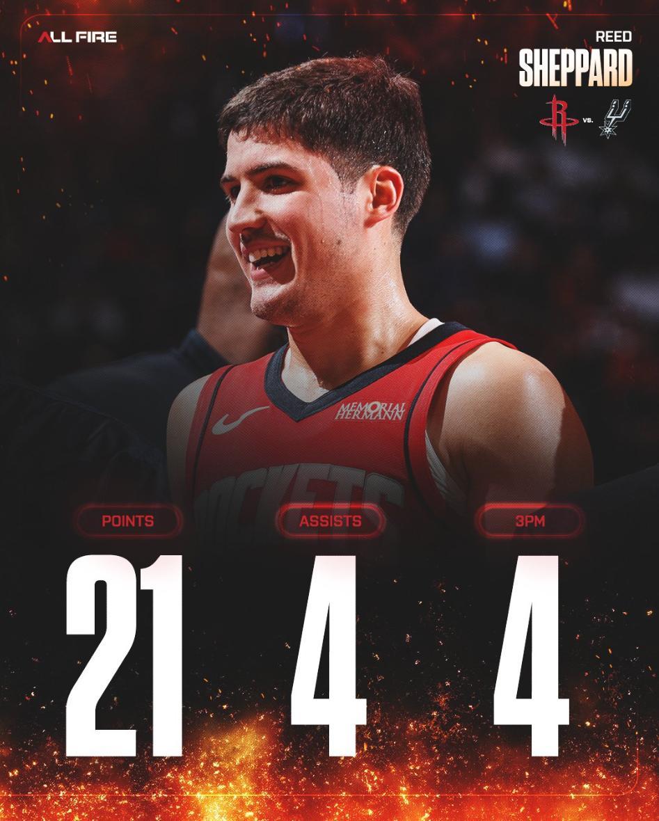 裏德-謝潑德在對陣馬刺一戰中大放異彩,末節7中4+三分5中3+罰球2中1拿到12分,他成爲火箭逆轉馬刺的第一奇兵,全場比賽拿到21分4助攻2籃板1搶斷1蓋帽4個三分球,謝潑德也因爲這場比賽被火箭多位記者盛讚。