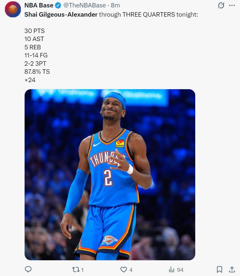 亞歷山大三節打完14中11,三分2中2,拿到30分10助攻5籃板,真實命中率87.8%,正負值+24。