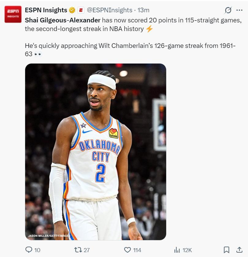 亞歷山大此役也達成了連續115場20+的紀錄歷史第二,他距離1961-1963賽季的張伯倫126場只差15場了。