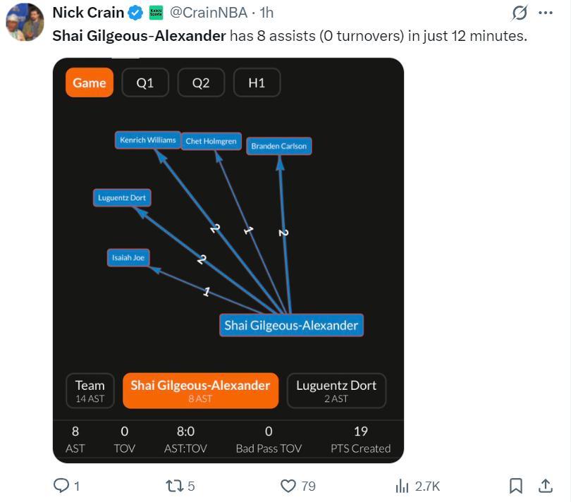 這場比賽的亞歷山大是全方位的壓制揚尼斯,在短短12分鐘裏SGA連續送出8個助攻平半場生涯新高:一次給喬、2次給多爾特、2次給肯裏奇、1次給切特、2次給卡爾森。亞歷山大作爲一名1.98米的控球后衛大局觀太強大了。