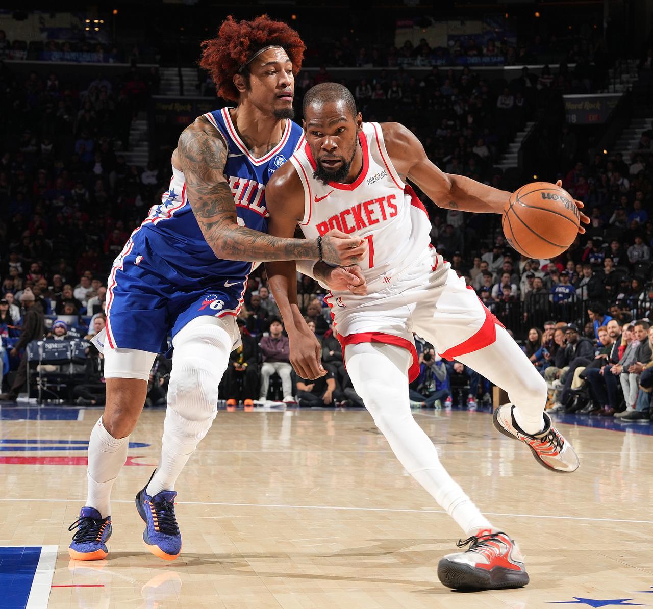 北京時間1月23日,火箭以122-128不敵費城。這場比賽凱文-杜蘭特延續了上一場的完美手感,烏佈雷、喬治、沃特福德輪番上陣都無法限制他,KD再度揮動他的死神鐮刀幫助火箭在一度落後9分的情況下一度完成反超,但進入加時賽KD的體能下滑連續的外線三分不中還出現了一個致命的進攻犯規。