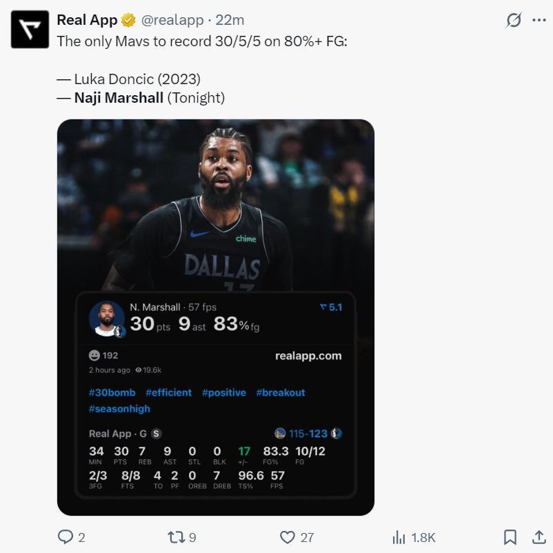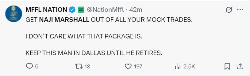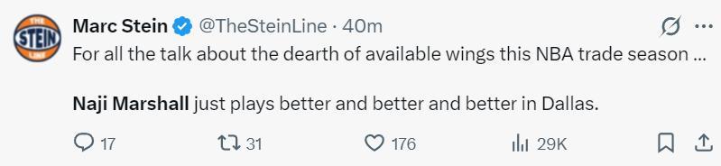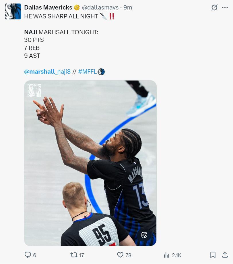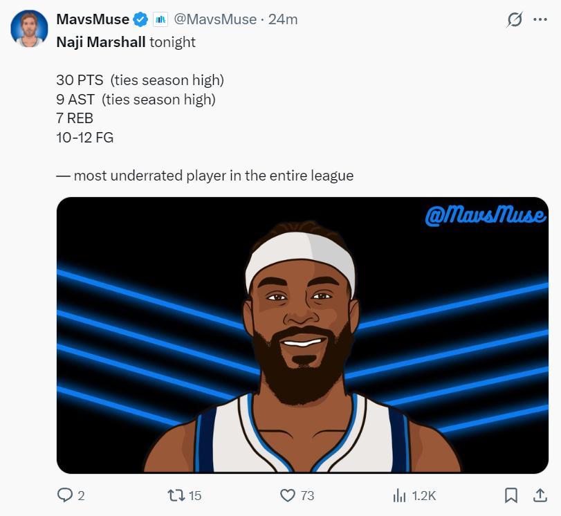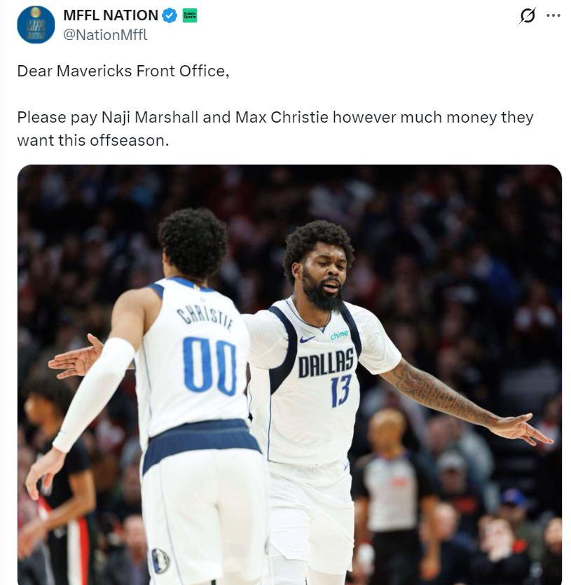 這場比賽後,獨行俠媒體MFFL NATION(熟悉獨行俠的球迷應該知道他是獨行俠死忠),他寫道:把馬紹爾從你們所有的交易模擬中剔除把,我不在乎你們願意拿出什麼籌碼,我們想把他留在達拉斯直到他退休爲止。