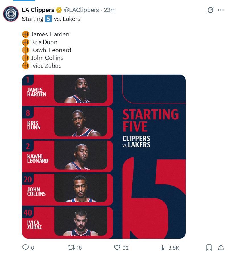快船:哈登、鄧恩、萊昂納德、科林斯、祖巴茨;