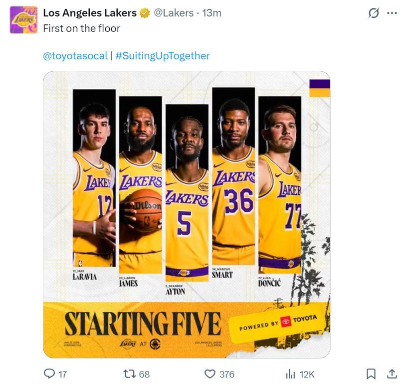 湖人:東契奇、斯瑪特、拉拉維亞、詹姆斯、艾頓;
