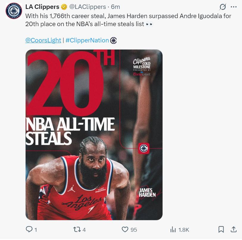 在完成個人職業生涯中的第 1766 次搶斷後,詹姆斯-哈登超越了安德烈-伊戈達拉,升至 NBA 歷史上最搶斷榜的第 20 位。