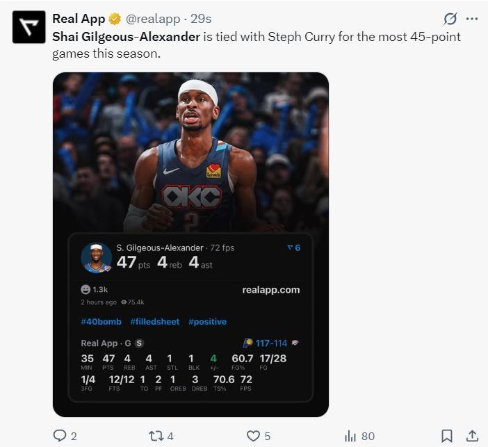 此役SGA創造多項紀錄:1.這場比賽SGA延續了自己連續116場20+;