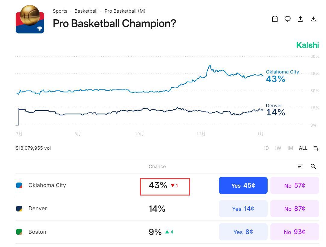 雷霆隊的奪冠概率再度下滑1%,目前是43%,雖然也是斷崖第一,但隨着他們之後繼續吞下失利,他們的奪冠概率會持續下滑,本賽季的雷霆輸掉太多不該輸的球。
