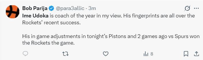 休媒對烏度卡的評價也是截然不同:在我看來烏度卡就是年度最佳主帥,火箭隊近期的成就他貢獻頗多,火箭擊敗活塞、馬刺的比賽他做了很多戰術調整。