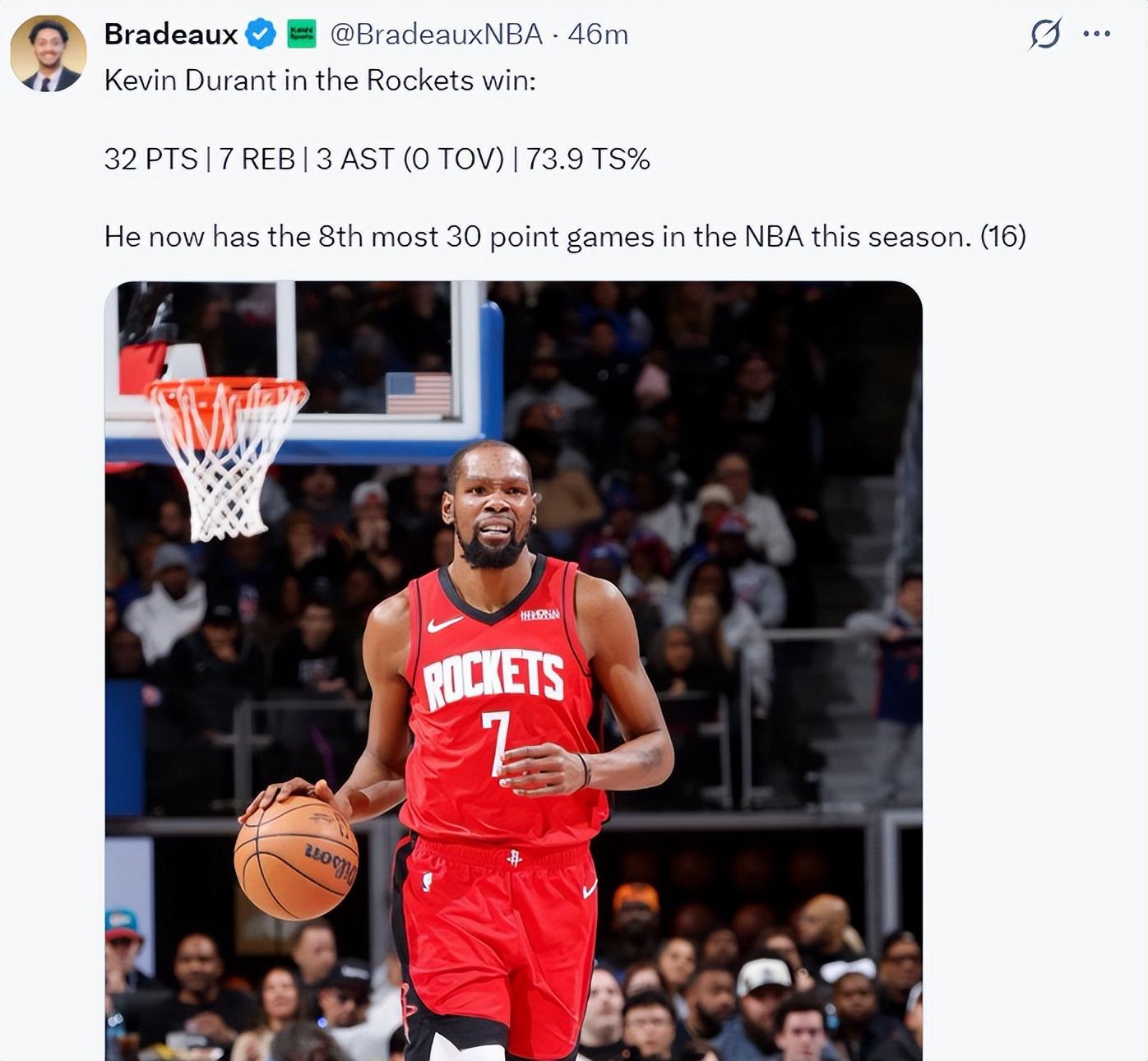火記也曬出杜蘭特的數據,實際上杜蘭特纔是這支火箭隊的基本盤,關鍵球都給杜蘭特處理更好。