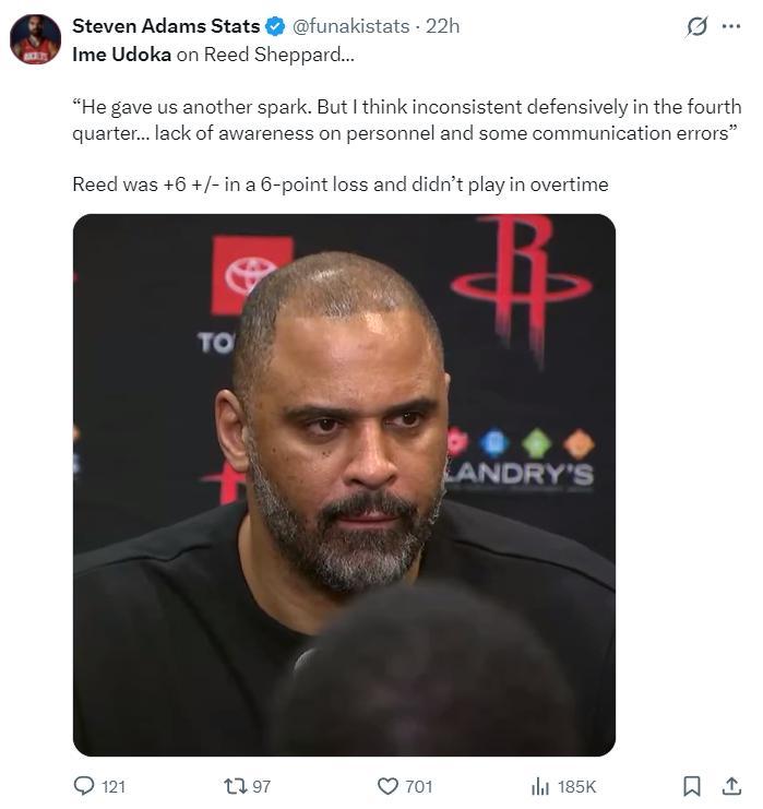 在被費城逆轉後烏度卡在賽後談到加時賽棄用謝潑德的話題,他表示:謝潑德在進攻端的確給了我們一股力量,但我覺得他在第四節的防守不夠積極,對場上的形勢把控不佳還有一些溝通上的失誤,所以加時賽沒有讓他登場。(第四節謝潑德9分1助攻1搶斷,加時賽被DNP烏度卡遭到休媒的口誅筆伐)