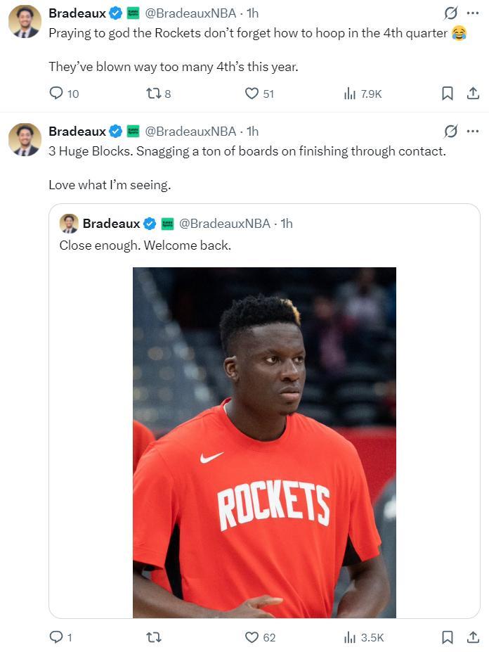 火箭記者也盛讚烏度卡激活了卡佩拉,在申京狀態不佳的時間段,卡佩拉提升了戰術地位尤其是第三節他打了足足7分鐘拿到2分2籃板1助攻1搶斷2蓋帽的數據,全場比賽16分鐘拿到5分9籃板1助攻1搶斷3蓋帽。