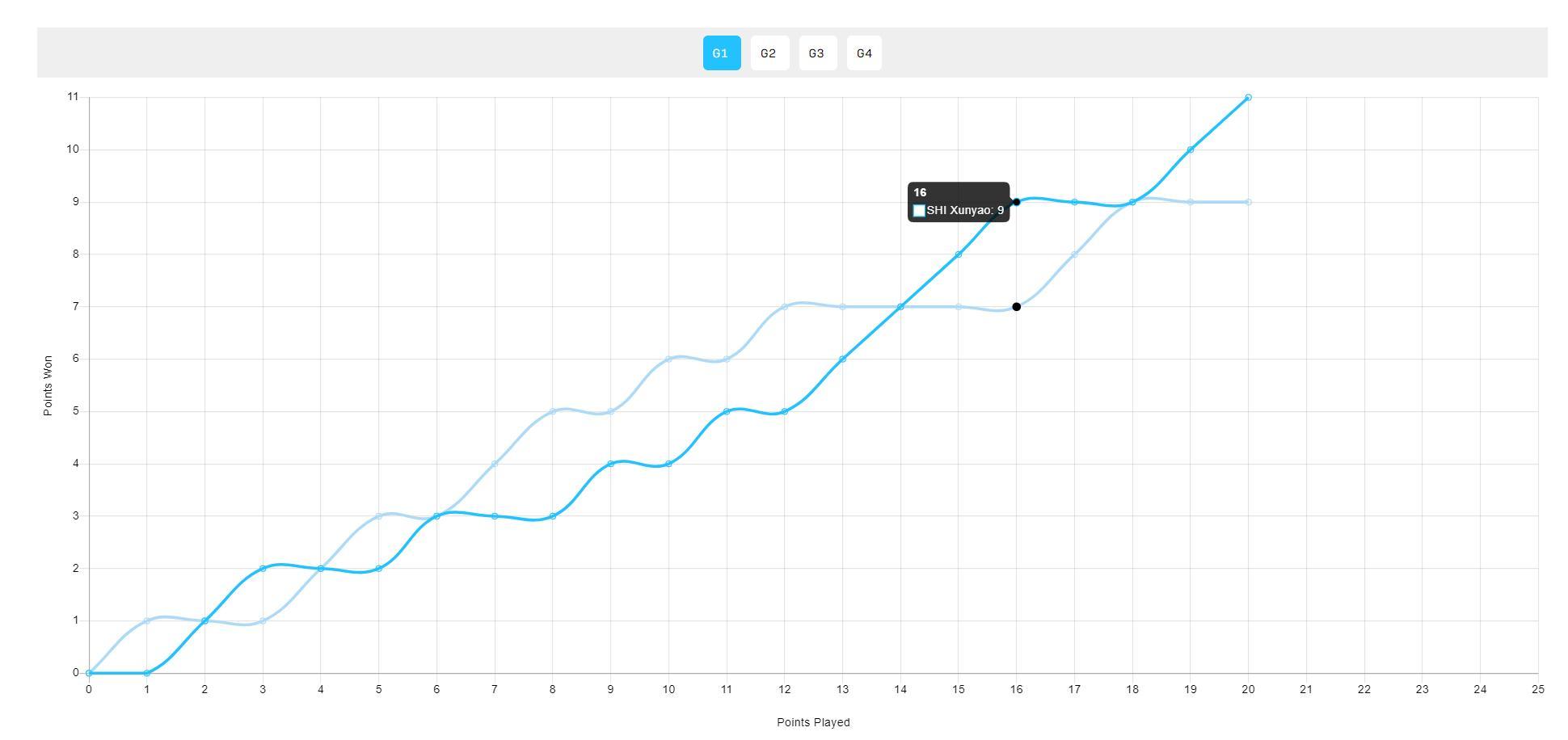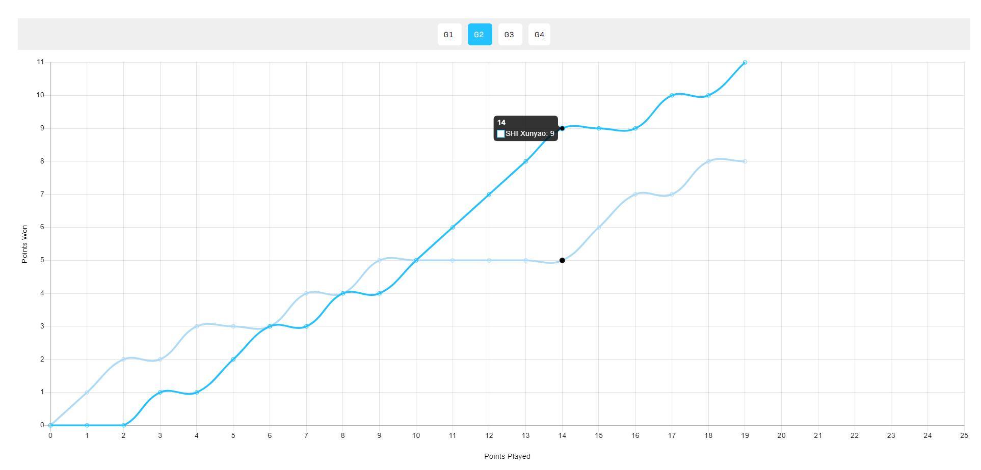 第二局石洵瑤也是後程發力,兩人打到5-5後石洵瑤連拿4分直接一波流9-5拉開分差,最終11-8拿下勝利。